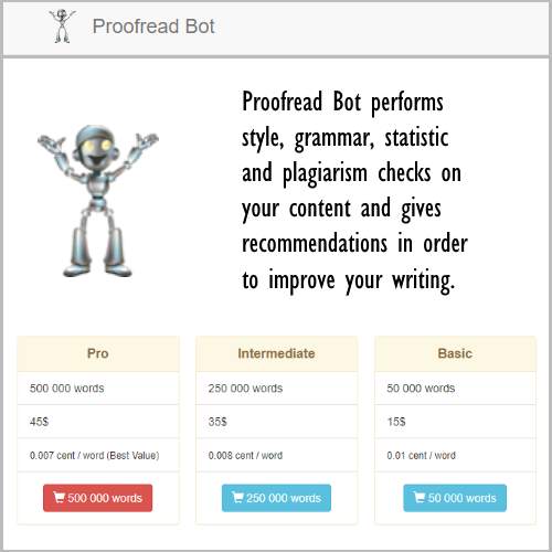 Online grammar checker and proofreading tool with cutting edge natural language processing that identifies complex grammatical and style issues. Proofread Bot performs style, grammar, statistic and plagiarism checks on your content and gives recommendations in order to improve your writing.